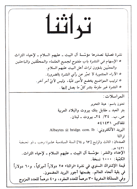 *صورة الغلاف : نموذج من مخطوطة رسالة تحفة الطالب بمعرفة من ينتسب إلى عبدالله وأبي طالب عليهما السلام للسيّد الحسين بن عبدالله الحسيني السمرقندي ، المتوفّى حدود سنة ١٠٤٣ هـ ، المنشورة في هذا العدد ، ص ٢٨٧ ـ ٤٣٤.