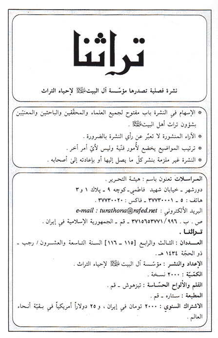 صاحب الامتیاز مؤسّسة آل البيت عليهمالسلام لإحياء التراث المدير المسؤول : السيّد جواد الشهرستاني |