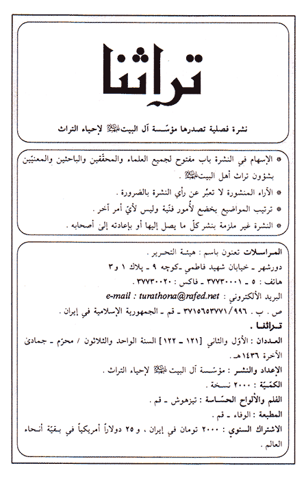 صاحب الامتیاز مؤسّسة آل البيت عليهمالسلام لإحياء التراث المدير المسؤول : السيّد جواد الشهرستاني |